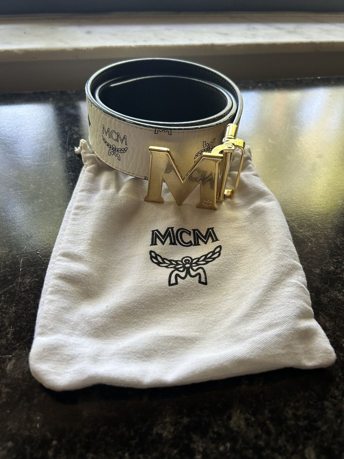 Black Leather Mcm Belts Traditional Mcm Scheme On Belt Black Mcm Buckle Size: 30-32 | Reversible MCM Belt in Black, Men's (Size 32)